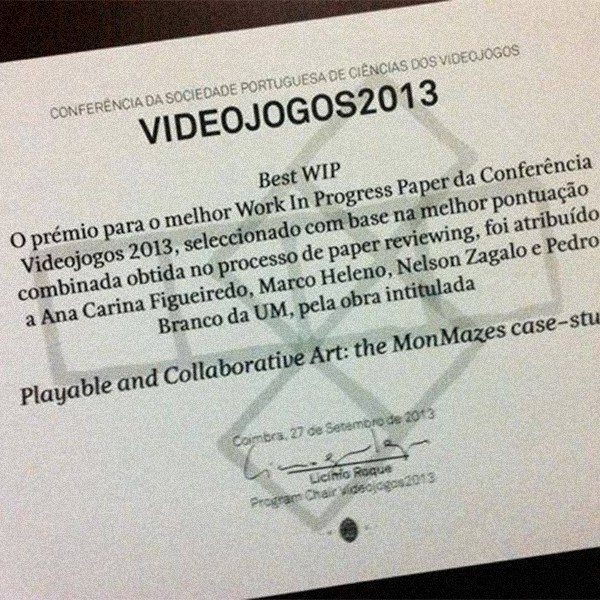 Best Videojogos 2013 ‘Work in Progress Paper’ for “Playable and Collaborative Art: the MonMazes case-study”. Figueiredo, A.C., Heleno, M., Branco, P., Zagalo, N. (2013) Playable and Collaborative…